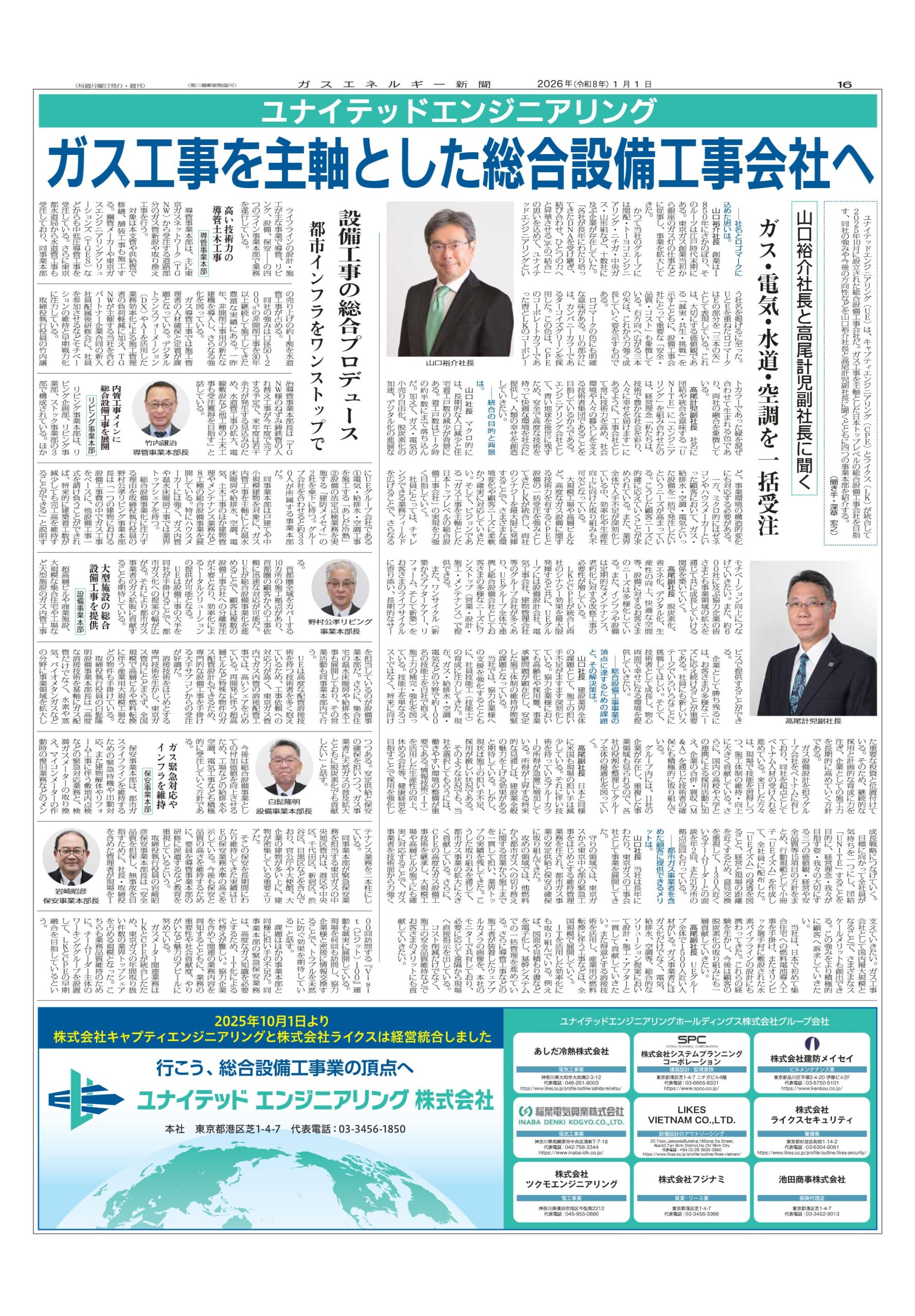 2026.01.01 ガスエネルギー新聞の掲載について ガスエネルギー新聞1月1日号に山口社長と高尾副社長ならびにライン本部長の記事が掲載されました。 2026.01.01ガスエネルギー新聞記事(PDF)